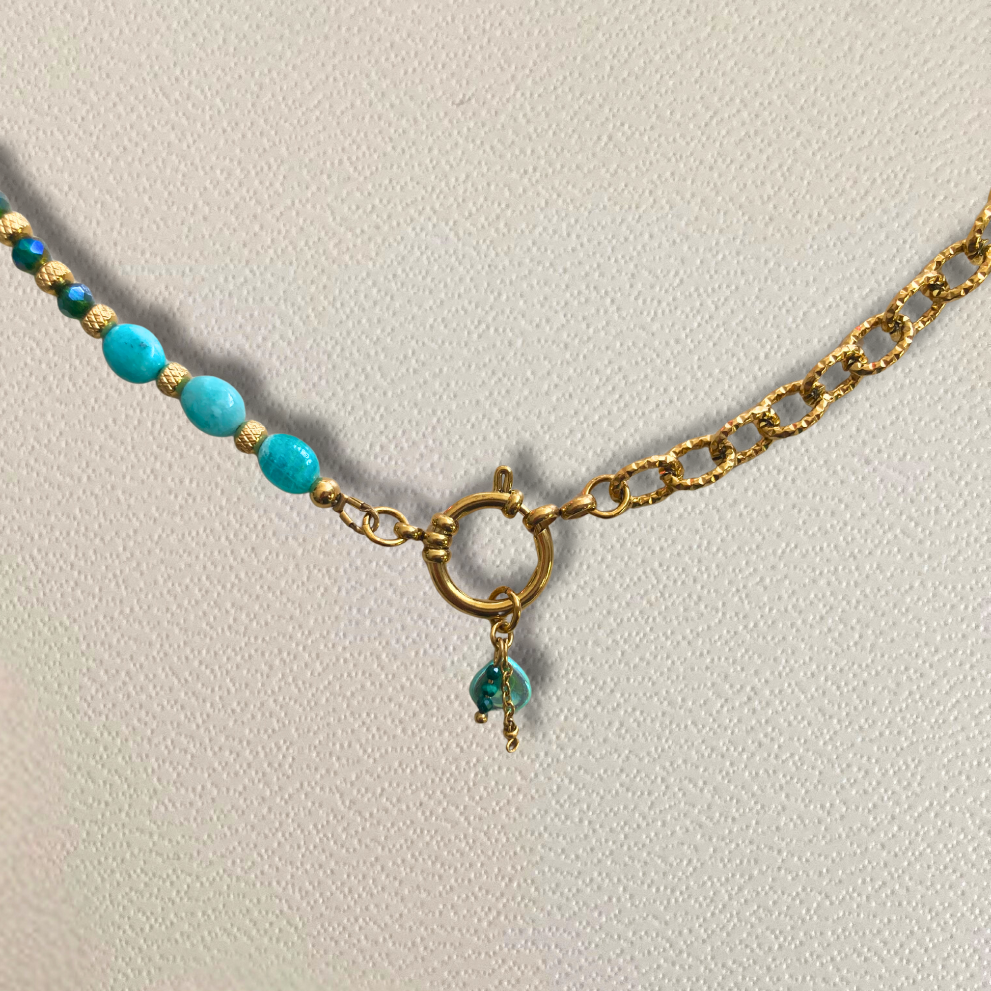 💎 Pierres d’Amazonite et de Malachite, cristal de verre tchèque, chaîne et fermoir en acier inoxydable doré à l’or 18K.