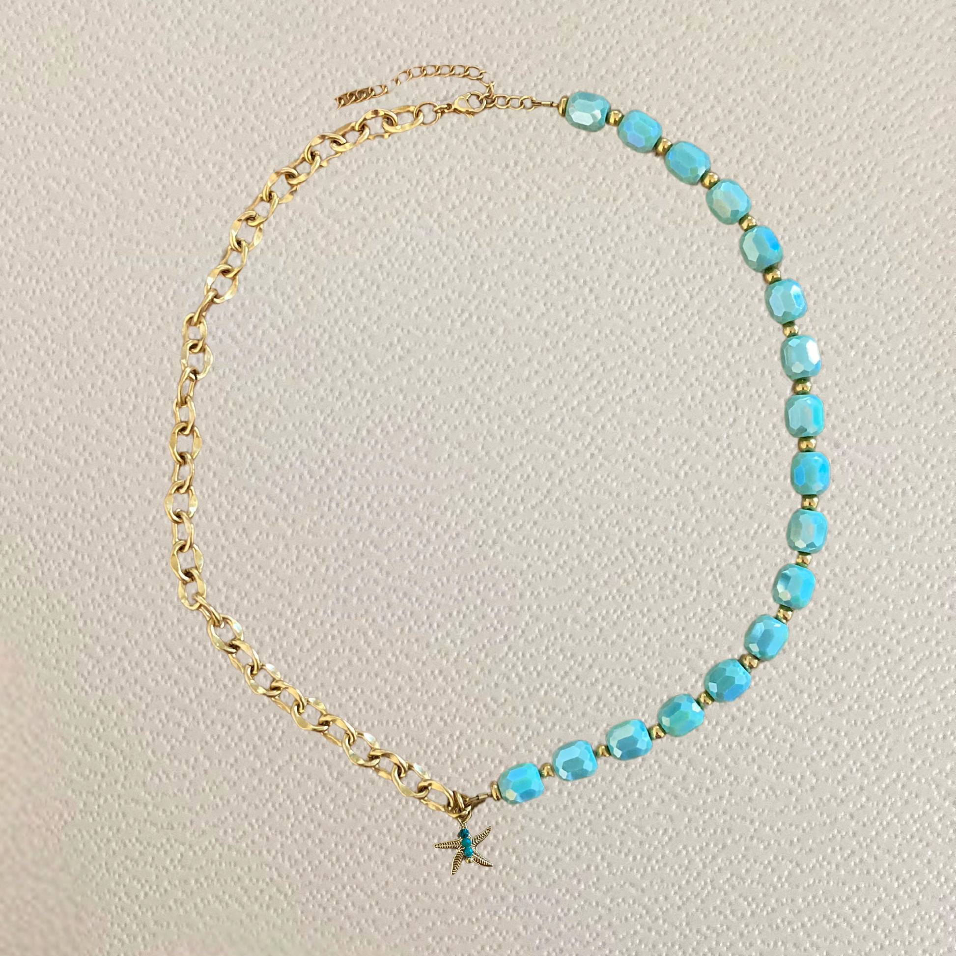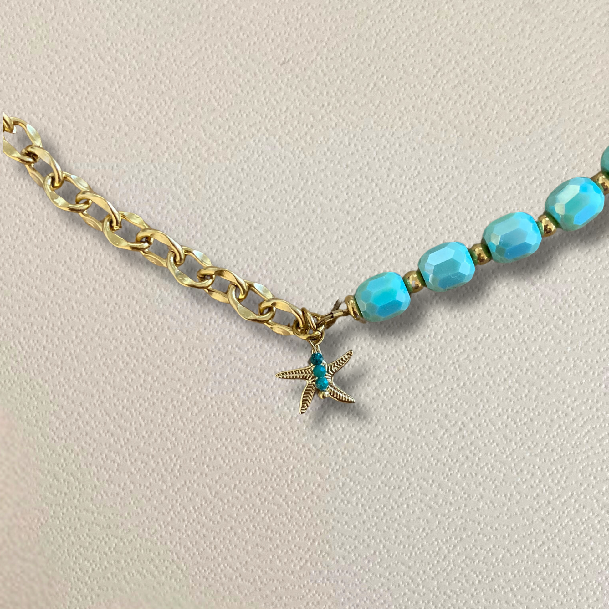 💎 Cristal de verre tchèque, pierres de Malachite, chaîne et charm Étoile de mer en acier inoxydable doré à l’or 18K.